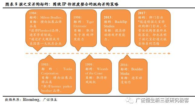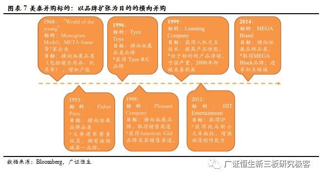 海外巨头孩之宝自1991年至今,将并购看作推进公司战略,围绕IP深度整合,以打造世界一流玩乐体验为目的的纵向并购,作为收购方参与且已经完成的并购交易共21笔,其并购标的包括游戏开发、动漫内容制作等泛娱乐业的其他环节,明显可见孩之宝围绕IP做深度整合的并购策略以及建立泛娱乐型企业的野心;孩之宝围绕IP纵向深度整合的成功使得其近17年市值持续增长。在玩具行业消费属性不强时,同为海外巨头的美泰通过横向并购快速地扩张了其品牌线,市场规模一直位于孩之宝之上;但当玩具中包含的文化元素越来越多,玩具行业的消费属性越来越强时,孩之宝的围绕IP作深度整合的纵向并购策略近年来大获成功,助力孩之宝业绩及市值均超越昔日霸主美泰。
