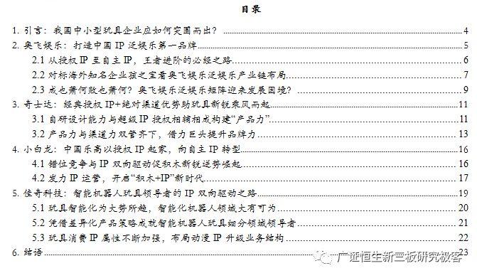 本文通过对几家中国本土头部玩具企业的突围路径进行剖析,为我国大多数中小型企业的发展提供了宝贵的借鉴意义。对于我国玩具公司而言,以传统OEM起家至授权IP突围,进而通过自主构建IP,或寻求产品的纵深化,或寻求泛娱乐多元布局成为大多数企业的发展路径,而此过程IP运营能力为核心。在企业发展初期,缺乏IP属性或IP运营能力较弱,此时通过打磨好产品、形成差异化战略从而拉动产品销量、促营收规模增长从而突围而出为重点,而这种差异化竞争战略,既可以像佳奇科技强化智能机器人的科技属性从而形成产品差异化,又可效仿奇士达*管双**齐下,一方面网罗全球大部分主流的销售渠道形成渠道差异化,另一方面依靠自主产品设计形成产品差异化。当企业进入新一轮的发展周期时,以自主打造IP、提升IP运营能力成为了大多数企业所选择的商业路径,既可以是围绕单一产品纵深化而打造IP,例如佳奇科技,也可以是泛娱乐多元化布局,例如奥飞娱乐。而伴随着泛娱乐行业头部聚集的趋势愈发明显,对企业的IP开发与运营能力也提出了更高的要求;因此,在大多数公司的体量不是很大的情况下,选择单一领域纵深化,采用循序渐进、风险更为可控的商业路径是更为明智的选择。在此基础上进一步分析,可知以奥飞娱乐为例的泛娱乐矩阵布局对于资源、团队运营实力的要求很高,风险也很大,对于绝大多数体量较小、还没有达到一定综合实力的玩具企业而言不一定具备直接借鉴价值;而以佳奇科技、奇士达为例的循序渐进IP布局模式对于初始投入的要求较低,风险也更为可控,具备较强的直接借鉴意义。
