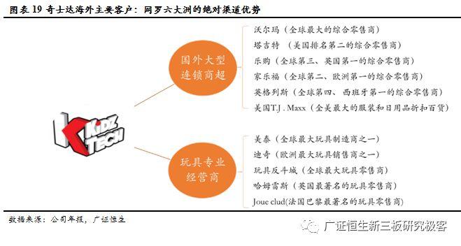 具体而言,奇士达于2015年收购香港奇士达,香港奇士达具备覆盖全球的销售网络以及多家国际知名品牌的授权,促公司双品牌产品销售规模大幅增加;公司的主要客户是国外大型连锁商超和玩具专业经营商,包括沃尔玛(全球最大的综合零售商)、塔吉特(美国排名第二的综合零售商)、家乐福(全球第二、欧洲第一的综合零售商)、乐购(全球第三、英国第一的综合零售商)、英格列斯(全球第四、西班牙第一的综合零售商)、美国T.J. Maxx(全美最大的服装和日用品折扣百货)等综合型商超;也包括美泰(全球最大玩具制造商之一)、迪奇(欧洲最大玩具销售商之一)、玩具反斗城(全球最大玩具零售商)、哈姆雷斯(英国最著名的玩具零售商)、Joue clud(法国巴黎最著名的玩具零售商)等玩具专业经营渠道和等等。奇士达依托自身强大的产品设计研发能力,通过获得海外知名IP的使用权,借助子公司强大的销售网络将绝大多数产品销往国外,国际知名IP授权与国际强大销售网络相辅相成,从而形成有别于其他玩具生产商的差异化核心竞争力。
