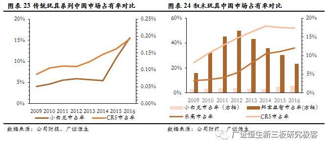 小白龙一直以来坚守在积木玩具领域,积木玩具领域属于较为传统的玩具细分领域,在2016年,全球积木玩具巨头乐高一枝独秀,市场占有率高达35%,CR5市占率也高达50%,小白龙并不属于中国CR5之列;从各个品牌的市占率年度变化情况来看,乐高、CR5与小白龙的市占率在逐年上升,而中国本土积木玩具第一品牌邦宝益智的市场占有率从16.65%的顶峰跌至7.83%的低谷,从此趋势中也可以看出中国积木玩具竞争激烈,小白龙却在洗牌期中凭借着差异化竞争脱颖而出。具体而言,一方面小白龙等中国本土产品在定价上与高端品牌的价位仍有一定的差异,从而与乐高等巨头形成了错位竞争的格局,避免了与巨头的直面交锋,而在中低端市场的本土品牌认知度不高,巨头产能不足的情况下,新兴品牌便更容易突围而出;另一方面,玩具的消费属性的重要程度日益凸显,而小白龙选择市场接受度高的形象,通过借助美猴王、猪猪侠等中国知名IP的授权杀出重围。如今,公司致力于打造自己的IP,公司目前自主开发了积木总动员、闪电飚车、三国机甲战士(漫画)、战神传、忍者大作战(游戏)、战兽传奇等形象及产品系列,双向驱动,从积木市场中分得一杯羹,市场占有率也在不断提升。