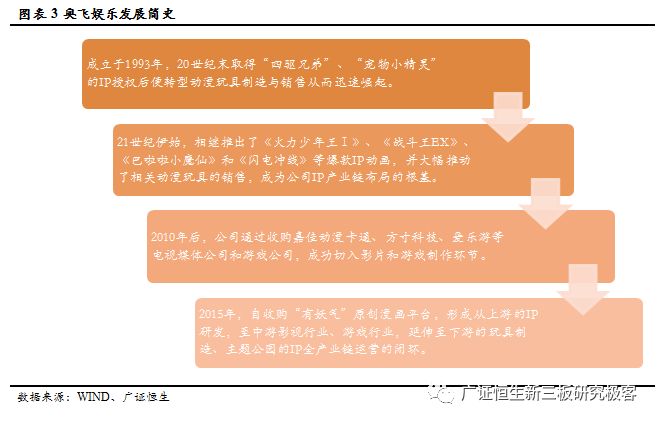 奥飞娱乐以传统玩具制造业起家,在20世纪末取得“四驱兄弟”、“宠物小精灵”的IP授权后便转型动漫玩具制造与销售从而迅速崛起;在21世纪伊始,不断壮大的奥飞娱乐便着手自主开发IP并取得一定成绩,相继推出了《火力少年王Ⅰ》、《战斗王EX》、《巴啦啦小魔仙》和《闪电冲线》等爆款IP动画,并大幅推动了相关动漫玩具的销售,成为公司IP产业链布局的根基。在2010年后,公司通过收购嘉佳动漫卡通、方寸科技、爱乐游等电视媒体公司和游戏公司,成功切入影片和游戏制作环节;2015年,自收购“有妖气”原创漫画平台之后,奥飞娱乐迎来新一轮的发展小周期,不断布局以IP为核心的泛娱乐生态体系,形成了从上游的IP研发,至中游影视行业、游戏行业,延伸至下游的玩具制造、主题公园的IP全产业链运营的闭环。