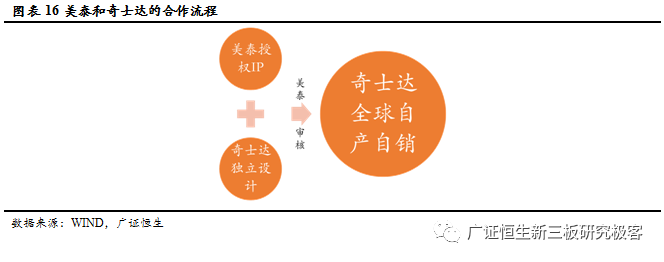 需要说明的是,跟代理销售美泰等知名IP已有产品不同的是,奇士达仅仅是获得美泰IP授权和支付一定的授权费,然后独立设计自己的产品,但需要经过美泰审核通过之后方可全球销售,自产自销。(1)对于美泰等知名IP授权方而言,此举能提升其利润率极高的授权费收入提升公司业绩,但因为涉及到品牌授权必须严防品牌价值受损,因此选择被授权方将非常谨慎,对方不仅仅有玩具生产制造能力,更需要有强大的独立设计能力和销售渠道。(2)对于奇士达等被授权方而言,只需要支付一定的品牌费就可以很好地回避了短期品牌构建难题并且经过授权方同意采用双品牌模式提升奇士达自有品牌KIDZTECH的影响力(品牌力的构建是一个长期战略,非一朝一夕),但自身必须得具备强大的独立设计能力、广泛的销售渠道,并对未来一段时间内的全球玩具趋势判断足够准确,否则将有自产自销不达预期的风险。