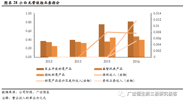 从小白龙的营收结构上看,授权动漫产品的增幅较缓,占比逐年下滑,从2012年的约26%下滑至2016年的约23%;而自主开发动漫玩具的增长势头较为明显,初步验证了小白龙自主IP的布局初显效果。在未来,随着小白龙围绕公司积木+IP的核心战略,加速布局上游内容制作产业并以此带动下游的动漫IP衍生品的销售,有望在开拓上游内容产业形成新业务收入来源的同时持续提升相关衍生品的销售业绩。