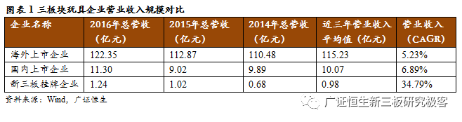 行业环境催生企业成长,受益于向好的行业环境,我国本土的玩具企业发展态势强劲,但是规模普遍较小,呈现百花齐放的态势,行业巨头虚位以待。据统计中国规模以上的玩具企业多达1455家(截至2015年10月),然而2016年玩具行业的CR4仅14.3%,整体集中度较低,行业整合空间较大。近三年,以2016年末的人民币兑美元汇率计算,海外上市企业的平均营业总收入达到了百亿人民币级别;国内主板上市玩具企业的平均营业总收入达到了十亿人民币级别;而国内多数中小企业,如新三板挂牌企业平均营业收入仅为亿元人民币级别。因此,对于众多的中小型玩具企业来说,如何把握住行业发展的契机,通过恰当的商业路径选择从而推动企业的发展,在行业整合中突围而出,已成为了近年来备受关注的议点。