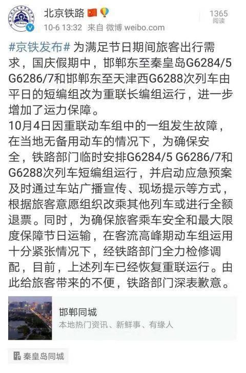 其表示,为满足节日期间旅客出行需求,国庆假期中,邯郸东至秦皇岛G6284/5 G6286/7和邯郸东至天津西G6288次列车由平日的短编组改为重联长编组运行,进一步增加了运力保障。