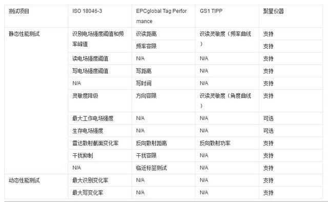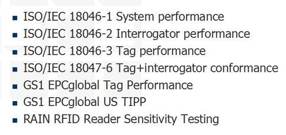 在RFID测试标准里面,RFID标签和读写器的测试有规范性测试(包括时序、波频、频谱等)和性能测试(包括反向功率、读距、反向距离等),RFID系统则包括效率测试和互操作性测试。