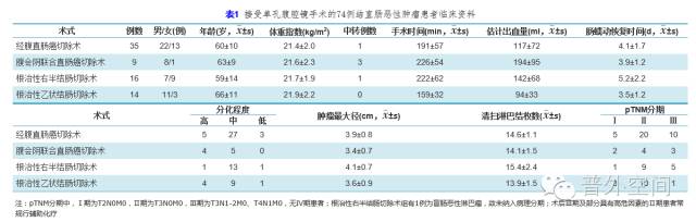 对例数≥5例的74例恶性肿瘤根治性手术患者的资料进行分析(表1)。术中并发症发生率为2.7%(2/74),中转5例(6.8%):经腹直肠癌切除术及腹会阴联合直肠癌切除术各有1例术中因输尿管损伤而中转开腹手术,腹会阴联合直肠癌切除术另有2例因患者肥胖及术中操作困难而中转4孔腹腔镜手术,根治性右半结肠切除术组有1例因既往下腹部手术史致回肠粘连致密中转开腹手术。