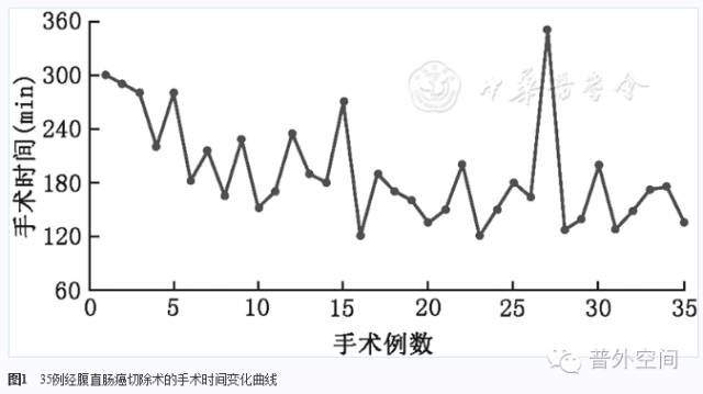 我们发现,开展20~30例单切口腹腔镜经腹直肠癌切除术后手术时间明显缩短。手术时间仅仅反映技术的可行性及术者适应技术的能力,并不能充分说明肿瘤治疗的安全性;学习曲线还与中转率、术后短期结果、临床预后等多因素相关;此外,针对恶性肿瘤的治疗,病理学结果也应考虑在内。