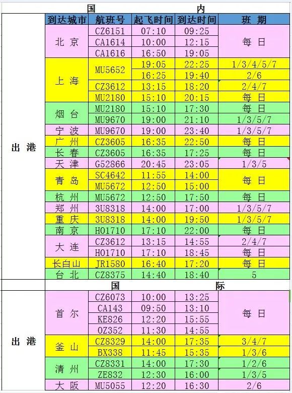 注:自5月1日起南航延吉-釜山航线班期由原来每周四、日,改为每周三、四、日;计划增加南航延吉-台北航线。以上航班信息以当地时间、当天时刻为准。