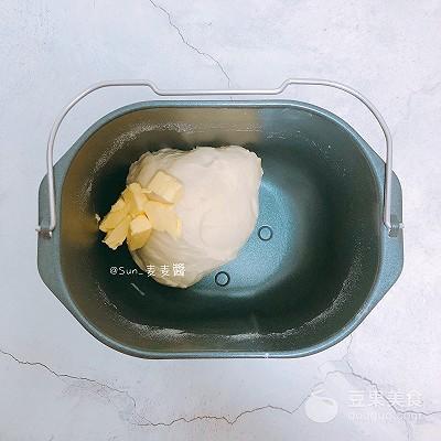 1、原料除黄油外全部投入面包桶内,面包机和面15分钟