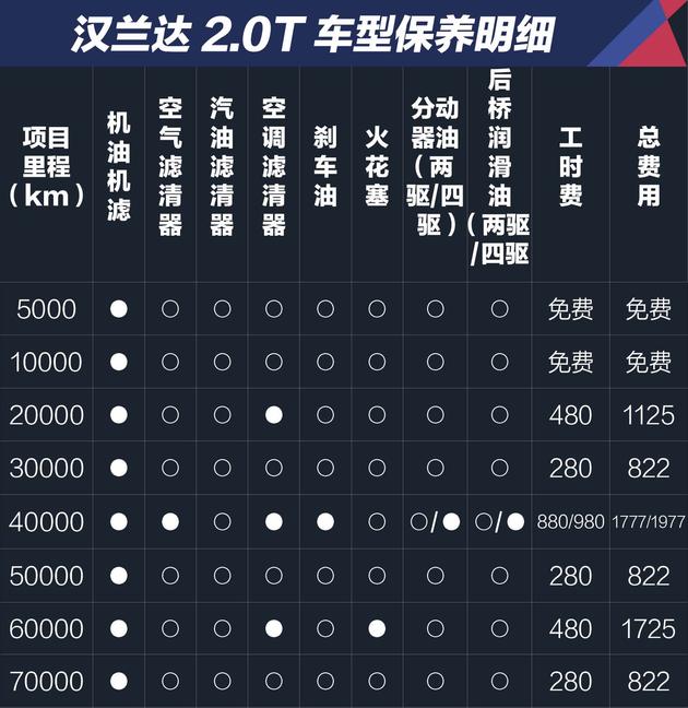 后期养护方面,汉兰达并没有想象中那样高昂,这主要得益于10000公里的保养周期,每次小保养的材料费+工时费一共800元左右。使用五年、行驶7.5万公里的总花费在8000元左右。对于这样一台中型SUV来说还是比较实惠的。