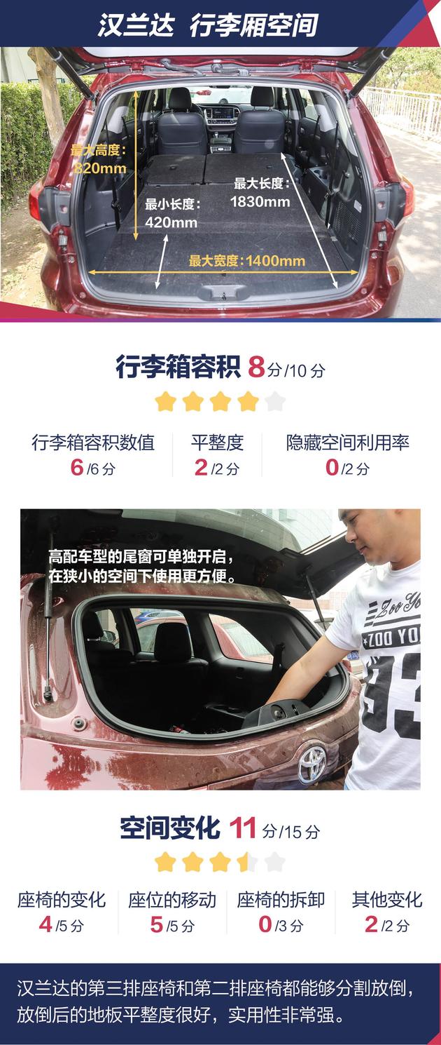 汉兰达最大的优势还是它超强的空间实用性,除此之外,其它各方面的表现它也没有明显不足,做出一台没有明显缺点的车并不容易,这也是汉兰达长期以来都能稳居销量榜首的原因。有关汉兰达更详细的测试成绩,请关注我们的超级评测报告吧!