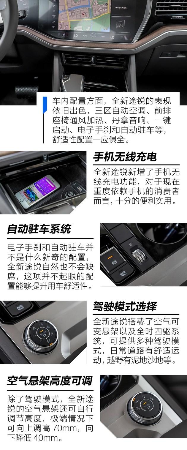 动力小结:其实全新途锐的动力系统可以说是全部换新了,原有的3.0T V6机械增压变为涡轮增压,同时还新增了2.0T的四缸涡轮增压发动机。在实际的驾驶体验中,3.0T涡轮增压发动机的性能相当出色,可以在较低的转速下就能达到最大扭矩。而且4MOTION全时四驱系统也让其越野能力更加的出众。