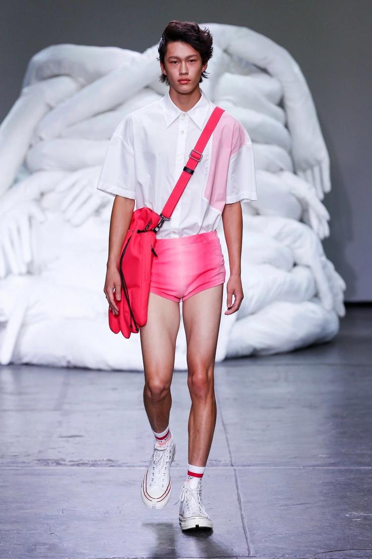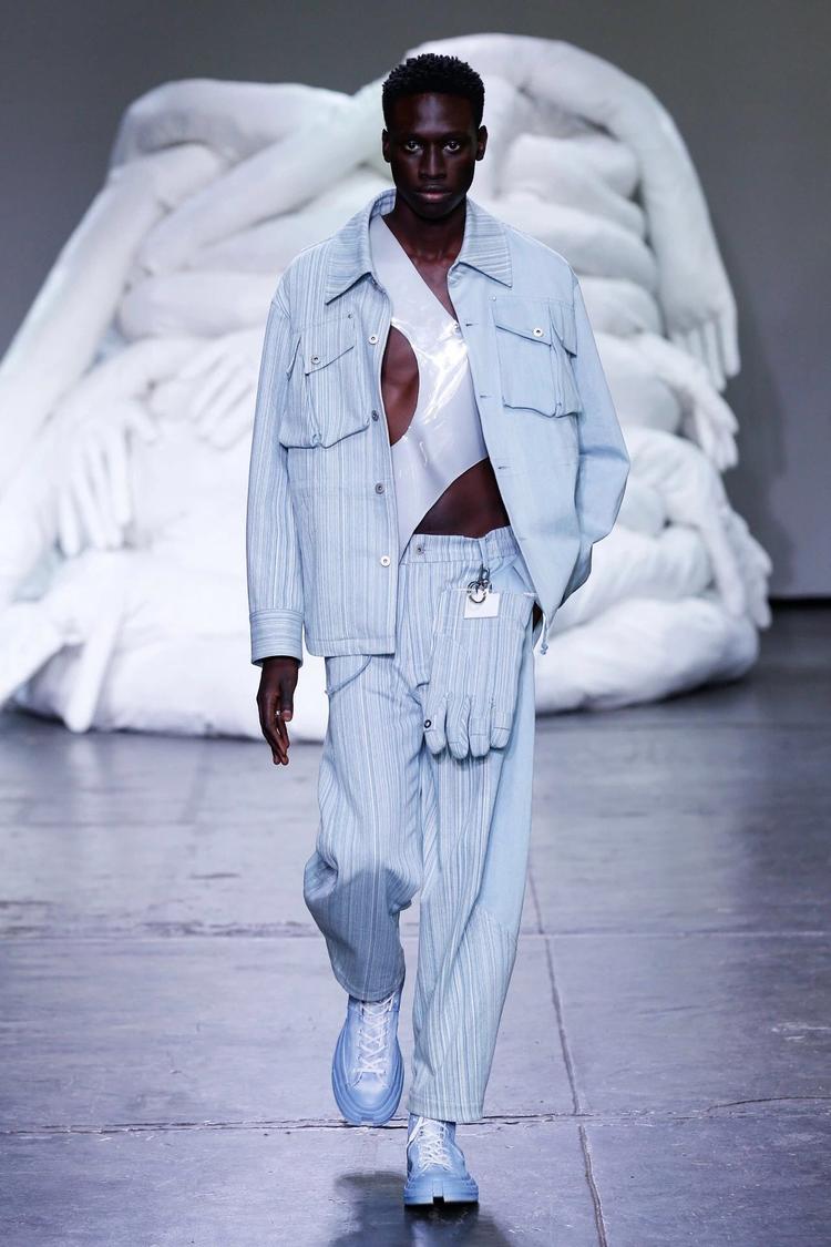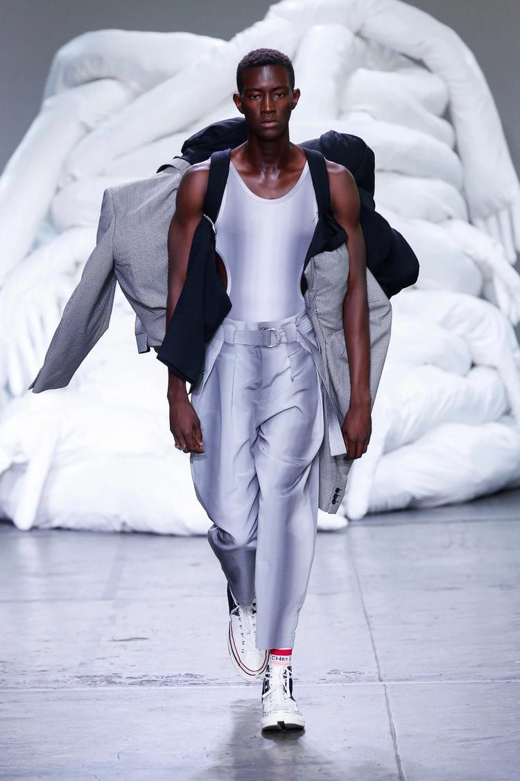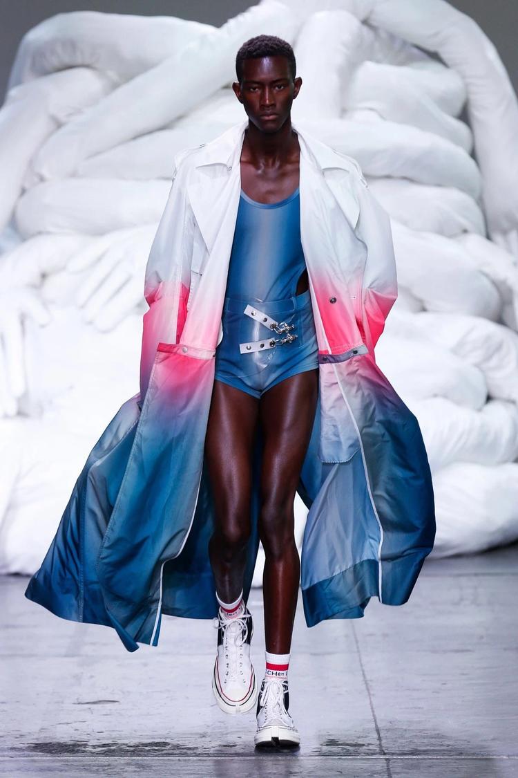 Feng Chen Wang 2019 春夏系列:新系列的关键词是“Half"。设计师在接受 BoF 采访时表示,Half “既有另一半的字面含义,也有对于生活与工作取舍的思考。渐变色与 PVC 材质制作的身体绑带是本季亮点。
