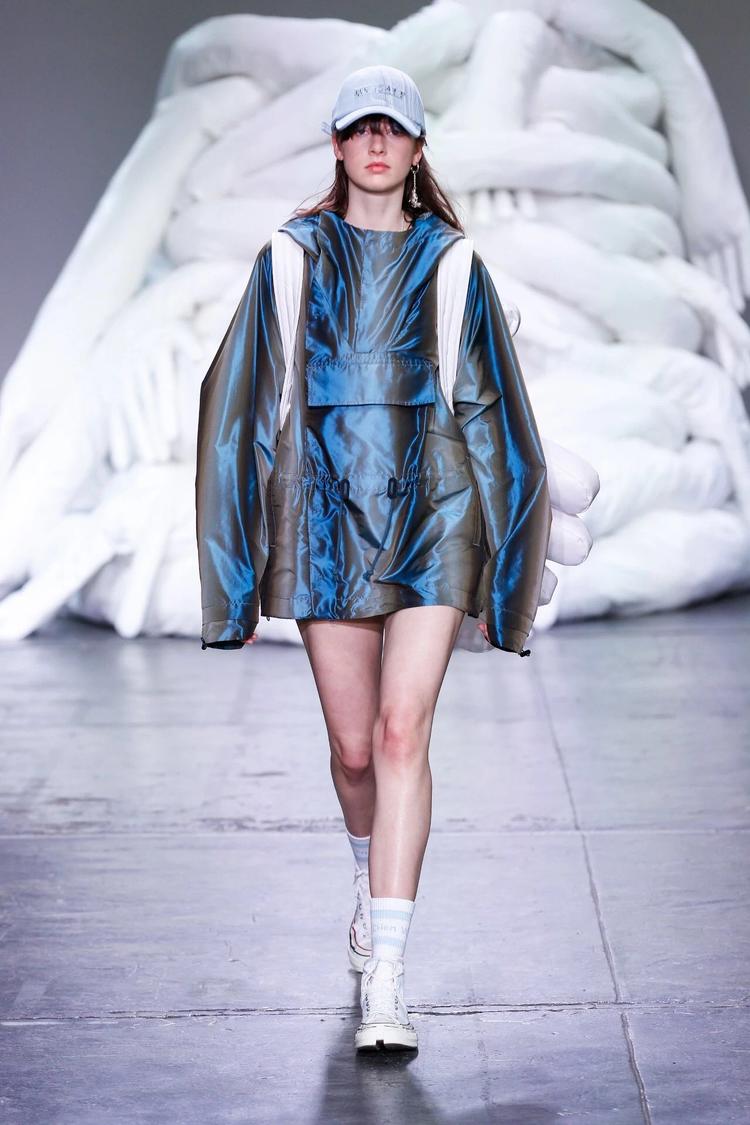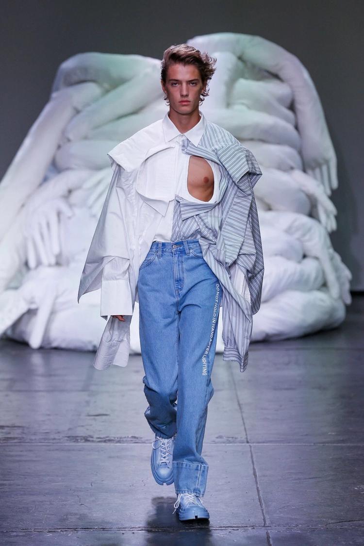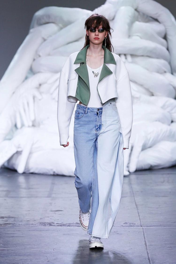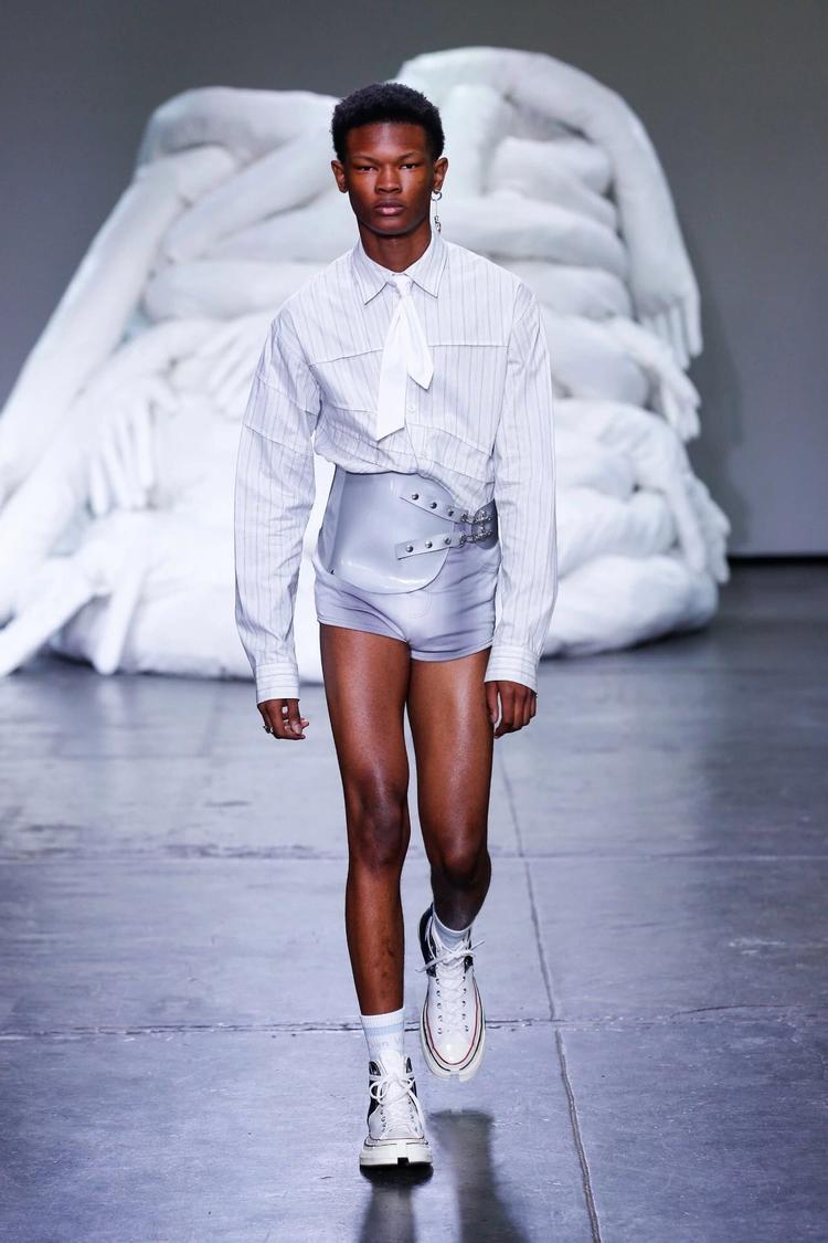 Feng Chen Wang 2019 春夏系列:新系列的关键词是“Half"。设计师在接受 BoF 采访时表示,Half “既有另一半的字面含义,也有对于生活与工作取舍的思考。渐变色与 PVC 材质制作的身体绑带是本季亮点。