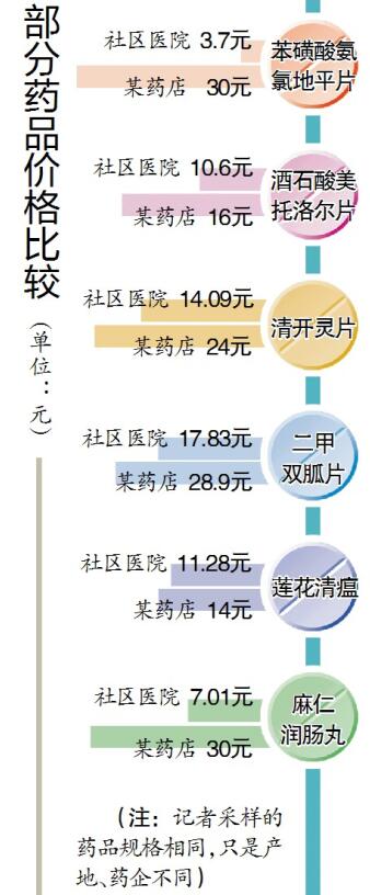 在社区医院,降糖药二甲双胍片17.83元一盒;降血脂的新伐他汀19.07元一盒,还有治疗冠心病的益心舒31.56元一盒;银杏叶片5.5元、脑安片34.62元,也照市面便宜了7元至15元不等。