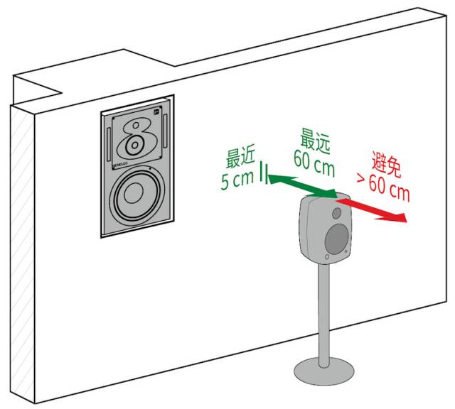 再者,可以将音箱远离墙壁放置,这样抵消频率将会降到音箱的低频截止频率以下。同时,音箱远离墙壁时,距离听音者通常更近,这增大了直达声的比例,使得监听效果更佳。
