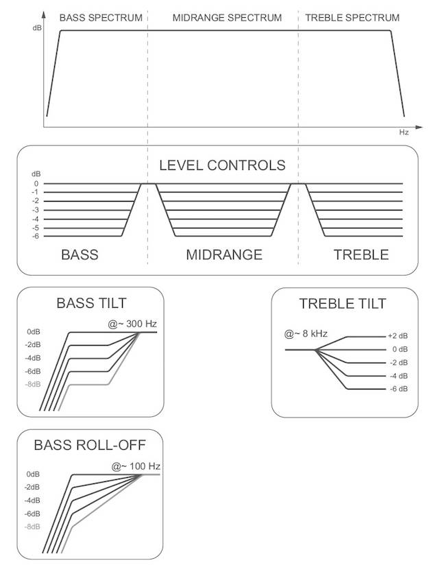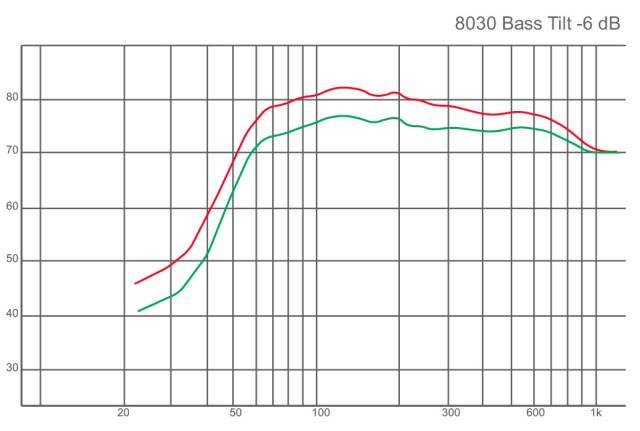 下图是一个音箱靠墙摆放引起低频增多的例子,通过开启低频搁架衰减(Bass Tilt)开关,可以衰减过多的低频,得到较为平直的频率响应。