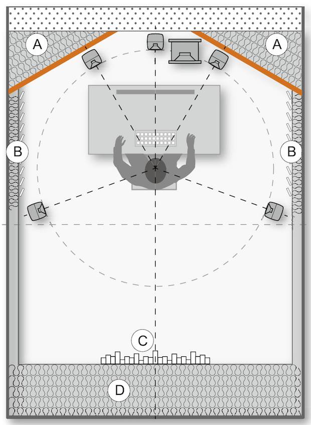 墙面和天花板可以被做成反射表面、扩散表面,或吸收表面。当然,实际使用时要把它们进行合理的结合。
