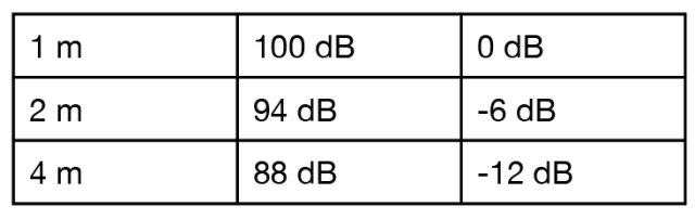 在自由场中(没有任何墙壁、地板、天花板等界面),距离增加一倍时音量降低 6 dB。