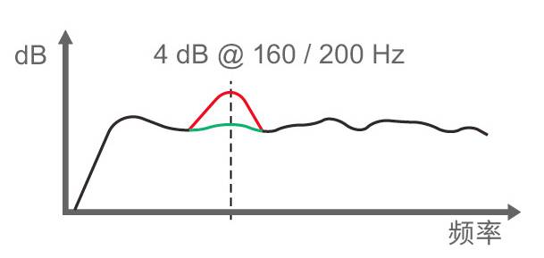 后墙反射会导致一些特定的频率产生抵消,造成频谱上出现若干距离不等的“谷”,这一现象也叫梳状滤波。最深的“谷”通常衰减 6 dB 到 20 dB。此时,并不能通过提升这些频率来进行补偿,因为墙面的反射也会相应增加。