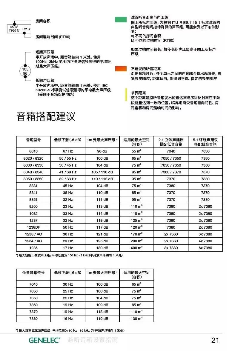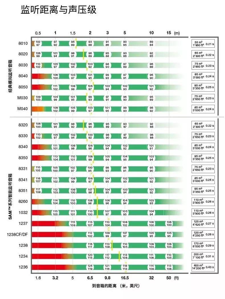 真力建议您通过听音距离和监听声压级来选择合适的监听音箱。选择低音音箱时,要与主音箱相互匹配。假如您需要更详细的参考,可以使用我们提供的线上选择工具,或咨询真力中国及当地经销商。下面的内容将帮助您确定听音距离和理想听音区域。