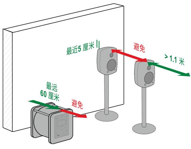 当使用低音音箱来重放低频时,主音箱的摆放可以更加自由。低音音箱需要靠近墙面放置,主音箱需要保证其后墙抵消频率在分频点以下。(完)