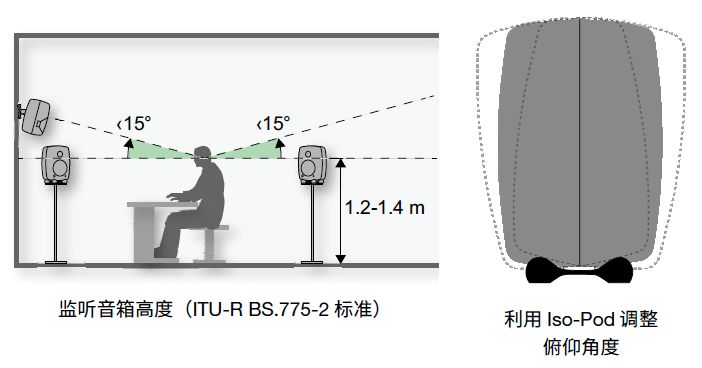 对于典型的二分频监听音箱,音箱声轴高度应与耳朵平齐,通常距地面 1.2 至 1.4 米。将音箱置于更高的位置,并稍向下倾斜,可以减少地面反射的影响。对于标准的立体声和多声道重放,请勿将音箱置于过高的位置上,声轴俯角应小于 15°。音箱需要始终指向听音点。音箱设置的越高,地板反射对于频率响应的影响越小。但需要关注,天花板也会造成低频反射,请勿将音箱置于超过层高一半的高度。