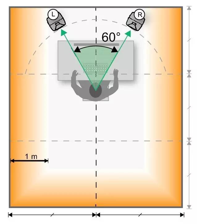 若以音乐制作为用途,请将音箱摆放到前区。将两只监听音箱呈 60 度夹角摆放,并指向听音位置。若以影视制作为用途,请将音箱摆放到后区。