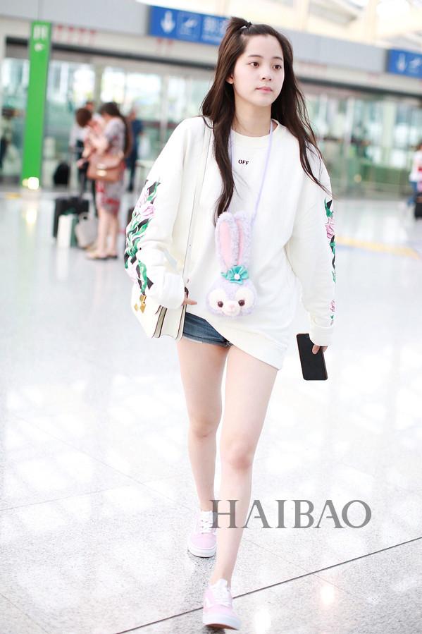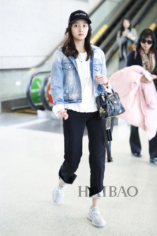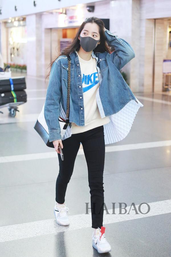 关晓彤机场街拍:身着Miss Sixty牛仔外套与白色连帽卫衣
