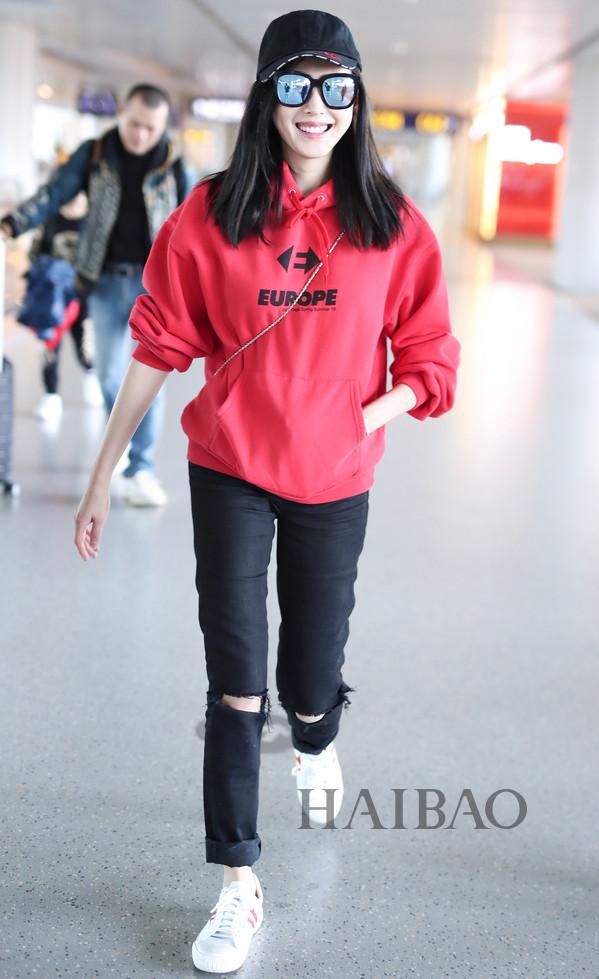 王丽坤机场街拍:身着PeaceBird Women红色连帽拉链卫衣,搭配纪梵希 (Givenchy) 长袜靴