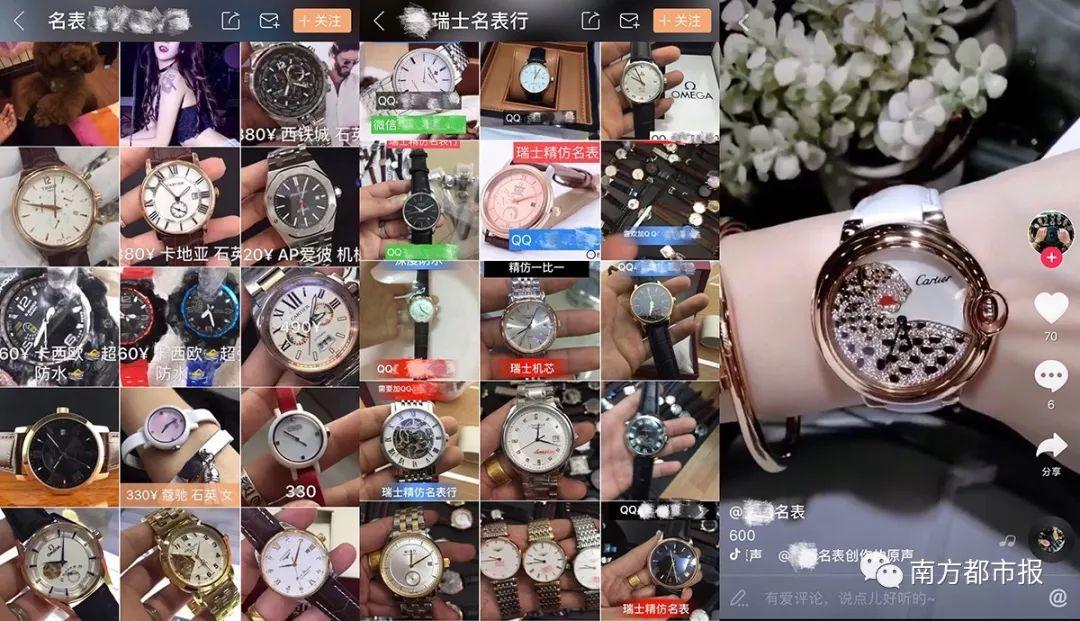 抖音、快手平台有大量展示山寨名表的短视频,部分明码标价,通过微信、QQ贩售。