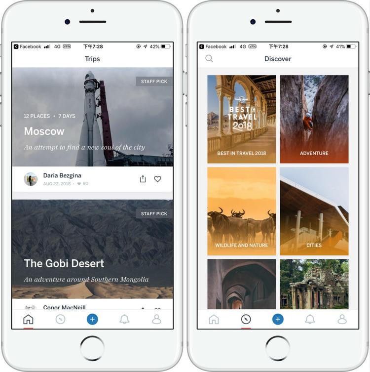 Trips是旅行指南《孤独星球》旗下的iPhone 应用,在这里你可以看到来自世界各地的旅行达人的游记分享。图片和视频是 Trips 最核心的功能,这个社区看上去就像是游记界的 Instagram,在每篇游记的封面图片右下角点击下拉才会打开全文,不仔细看的话,这就是个旅行图片分享社区。Trips 社区将游记分成了公路旅行、登山、冒险、城市、遗址等多个旅行主题,你没法订阅某个主题的更新,但是可以在探索页面里,找到每个主题的达人,关注他的动态。在主题探索的文章集合页面,重点也仍然是游记的封面图片。