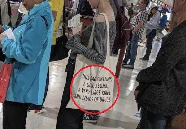 日前,美国Reddit网友发布了一张图,显示一名女生在台湾桃园国际机场里面背了一个写有英文句子的包包,上面写到:“这个包里装了一把手枪、一颗*弹炸**、一支大*首匕**和很多*品毒**。”短短7个小时内,这张照片收获了4万个“赞”,有不少网友评论道,如果是在美国,这个女生一定过不了安检,会被拉到小黑屋里盘问搜身。