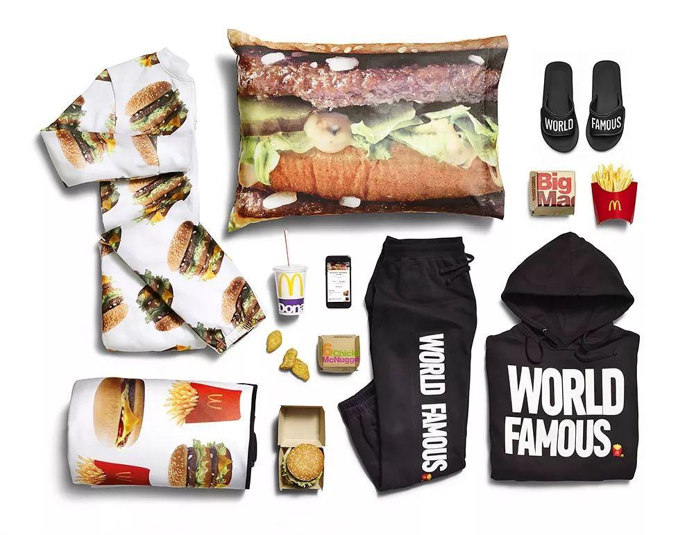 麦当劳的抱枕、帽衫、裤子和拖鞋,黑色那套还好,纯汉堡的看起来好魔性。
