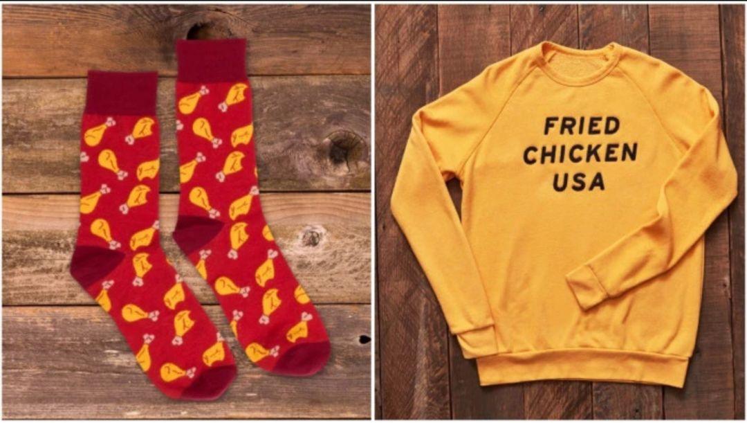 肯德基的炸鸡毛衫和鸡腿袜子,这配色有点小众原创的感觉。