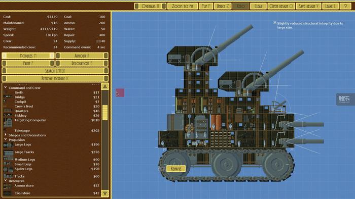 我最终认识到,这款游戏出人意料地非常具有策略深度,完成教程后造出来的飞艇只能说是徒具其型,一遇上稍微强的敌人就会被打爆,Steam中关于飞艇结构的指南写得专业又复杂,活脱脱一本蒸汽朋克版本的《航天飞行器设计》。不过游戏可以导入其他人的飞艇设计,贴吧和创意工坊也有不少人分享了不错的方案,可以直接拿来参考。