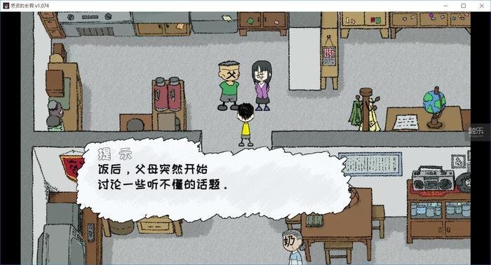 省略非必要信息的漫画式美工:父母和奶奶的容貌,粗暴地用一个汉字解决,大多数角色也不画眼睛,然而场景里充满年代感的家具、杂物都不马虎