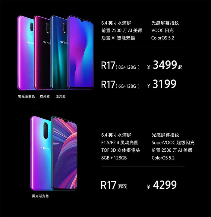 上次的周末刊中提到的是OPPO为R17预热,昨晚他们正式发布R17系列手机了,R17系列6+128GB、8+128GB版起价3199、3499元,而更高端的R17 Pro则把价格定在了4299元,与旗舰机的Find X相差只有700块钱了,但是处理器一个是骁龙845,一个是骁龙710。