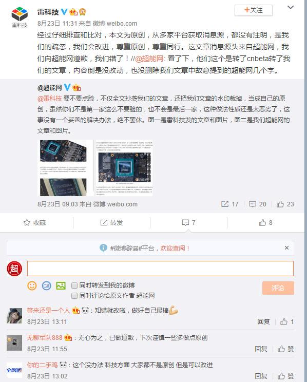 不同的是雷科技,他们在数码领域还是颇有名气的自媒体,在我们发文之后也看了一篇名为《还有这种操作?英伟达RTX 2080Ti竟然隐藏这个秘密》的文章,全文不仅文字大段雷同,而且他们的文章图片全都裁去了我们的水印。