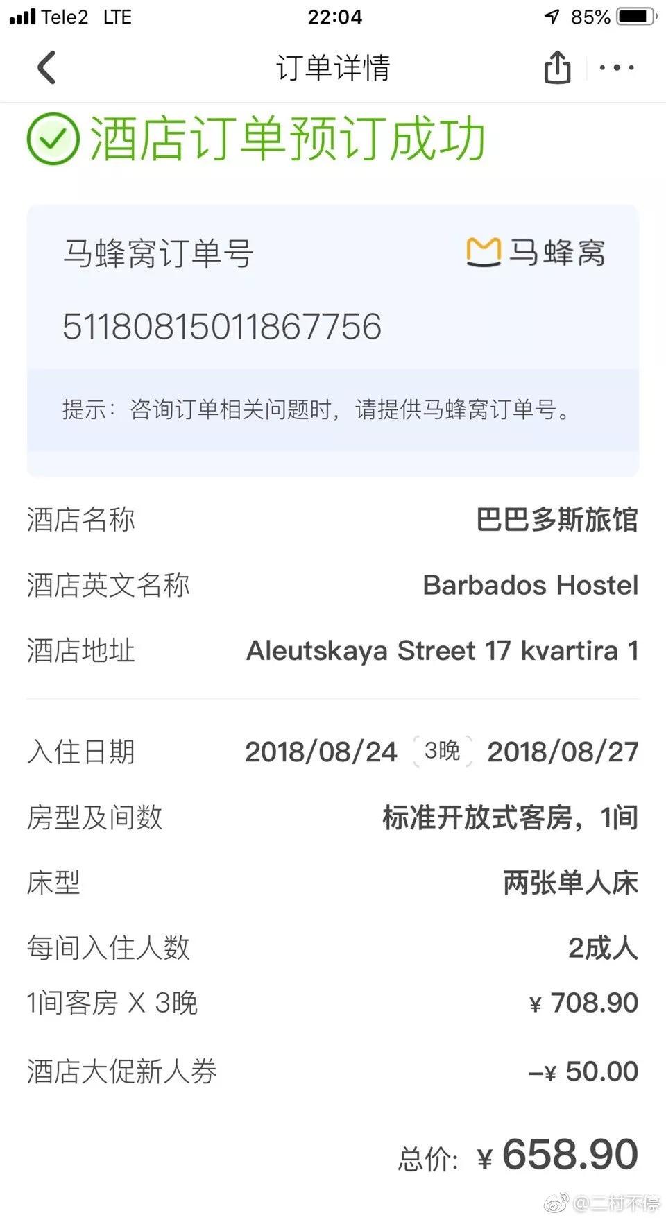 此外,@二村不停 也拜托在国内的朋友致电马蜂窝400客服,得到的结果是马蜂窝境外合作方将该网友预订的俄罗斯的Barbados Hostel错误的预订成了希腊的Barbados Island Hostel。