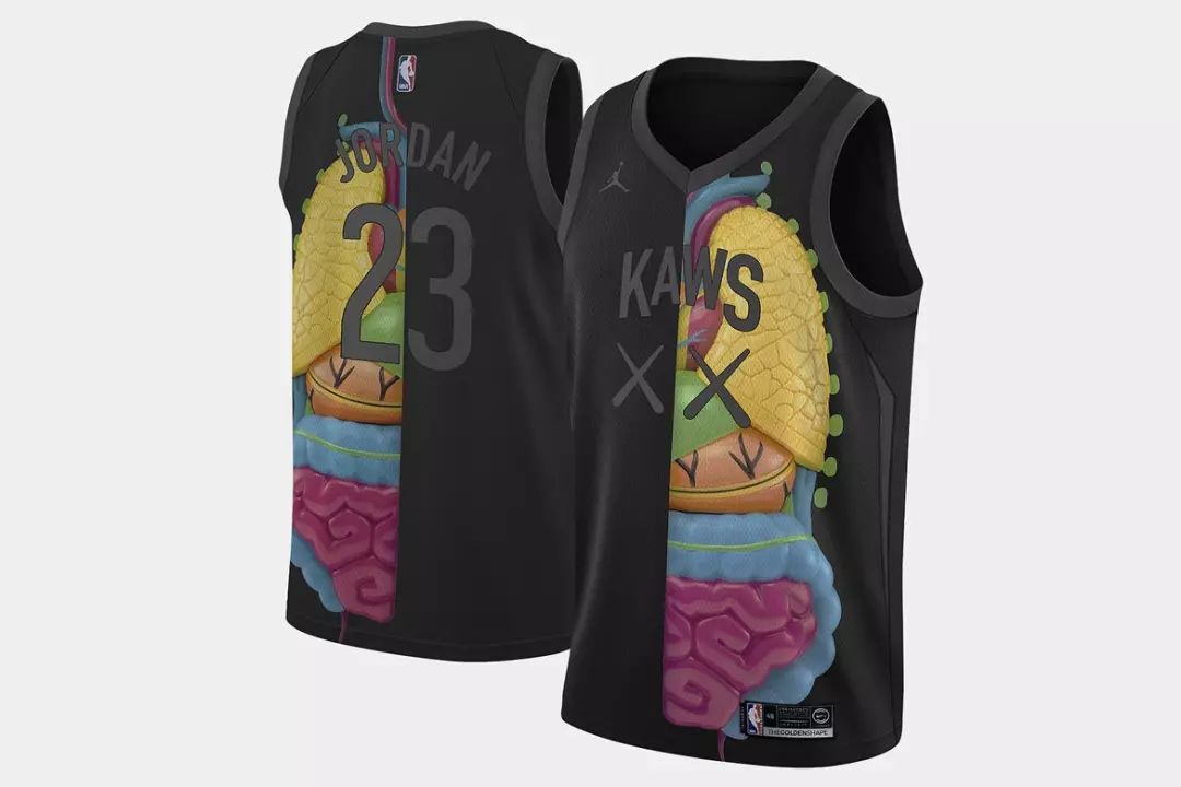 Supreme x Nike x NBA三方联名球衣话题热度超高,创作家The Golden Shape客制打造名为KAWS x Jordan x NBA的三方客制联乘球衣。
