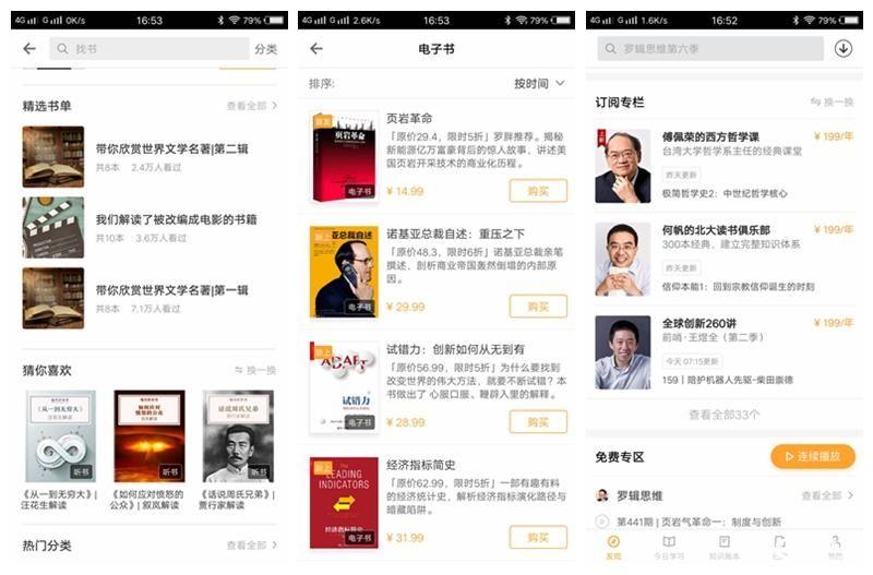 得到有两个方面的内容我很喜欢,一个是一些大师的订阅专栏,我订阅的不多,但确实收获很大。另一个就是每天听本书这个节目了,也许是和我自己的需求比较契合吧,好书不仅帮你分好类这么简单,还可以花20分钟听内容的解读,这样一来,每次看书前对书的内容都有一个简单的了解,大大降低了试错的成本。
