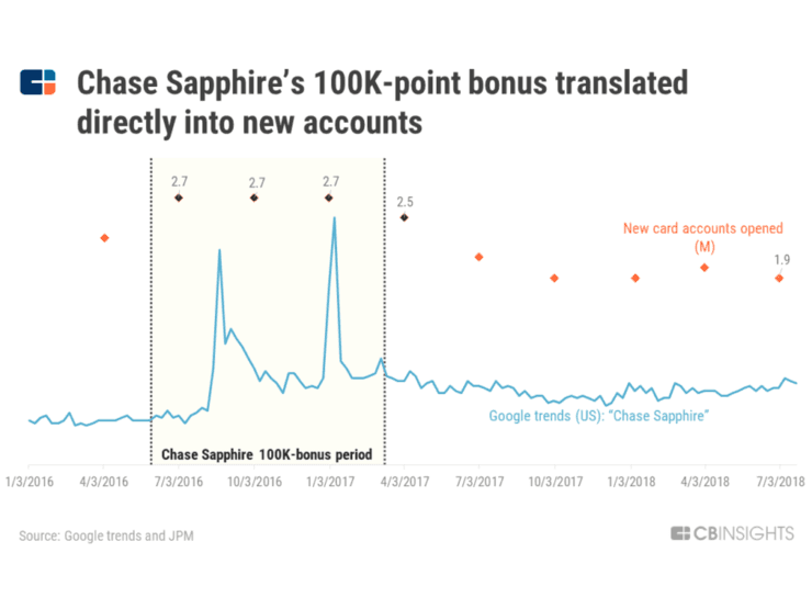 Chase的信用卡业务,尤其是 Sapphire,让摩根大通扩大了其高净值客户的数量。摩根大通视其信用卡业务为吸引新用户的重要工具。例如,在2016年,摩根大通前所未有地为其 Sapphire 信用卡提供了 100,000点注册补贴。这款信用卡迅速的席卷了市场,为摩根大通生态系统带来了数千名新的用户。公司由于这项活动,负担了2亿美元的支出,但摩根大通认为,比起 Sapphire 终生会员带来的价值,这仅是九牛一毛。