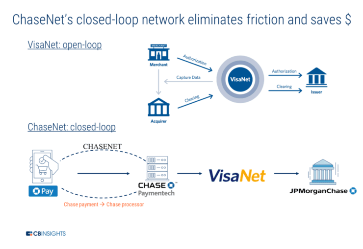 摩根大通银行在支付领域的创新引导了其闭环支付网络 ChaseNet 的诞生。通过和 VISA 的十年合作(从2013年开始),ChaseNet 已经能够在 Chase 账户之间实现转账交易。比起传统流程,这一系统在处理转账的时候花费的步骤更少,免除了资金在第三方间流转的必要,而仅需要在其闭环网络中流转。