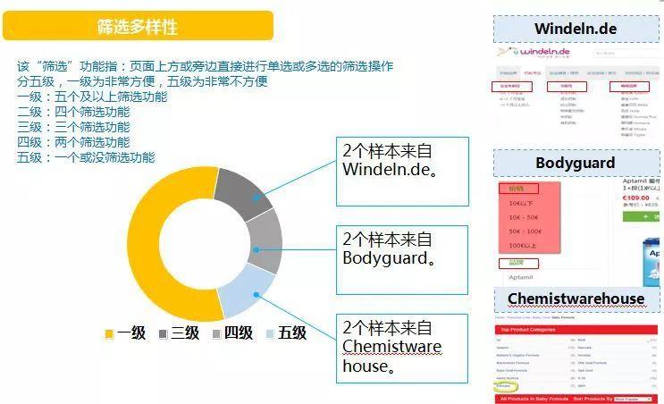 ③多数平台都有5个或以上的筛选功能,但Chemistwarehouse、Bodyguard和Windeln.de的筛选功能相对较少 ;