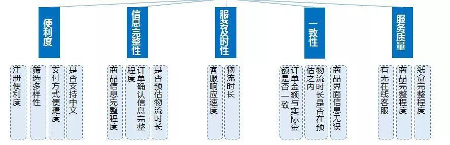 便利度、信息完整性、服务及时性、一致性、服务质量。