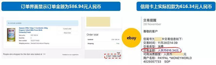 如订单界面显示订单金额为586.94元人民币,而信用卡实际扣款为616.34元人民币,差29.4元;