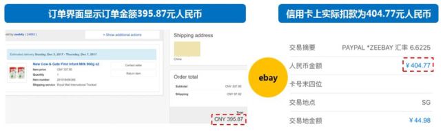 又如订单显示金额为395.87元人民币,实际扣款为404.77元人民币,两者相差8.9元。