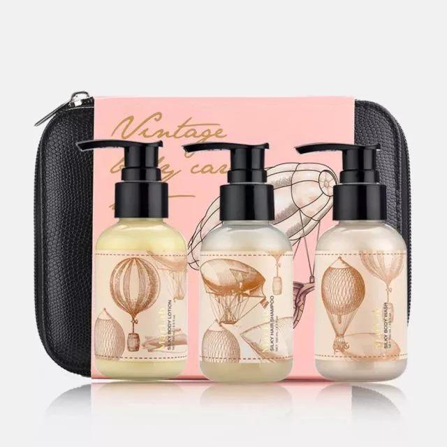 这一套有三样东西:沐浴液、身体乳、洗发露。从头到脚,全部搞定。每瓶的容量都是100ml,可以带上飞机。